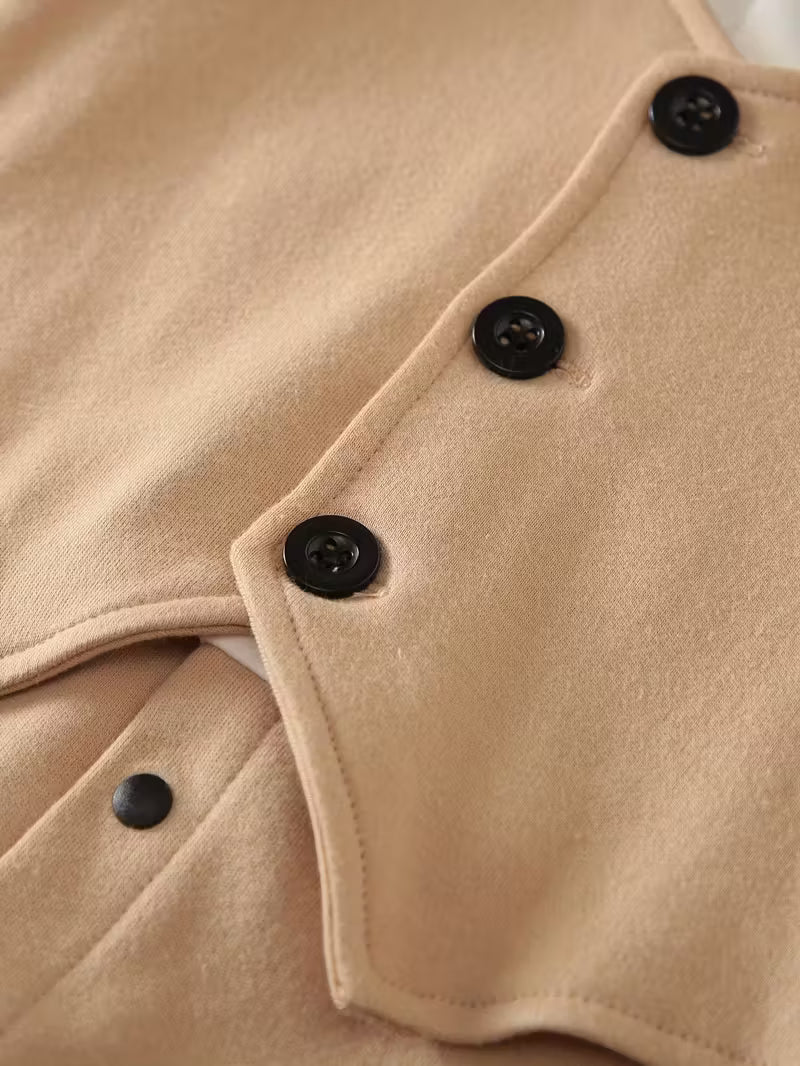 Avec son effet chemise blanche, son gilet beige raffiné et son nœud papillon noir, elle donne à votre bébé une allure distinguée tout en restant douce et agréable à porter toute la journée. Parce que pendant l’Aïd, il ne s’agit pas seulement de célébrer… il s’agit aussi de créer des souvenirs inoubliables.